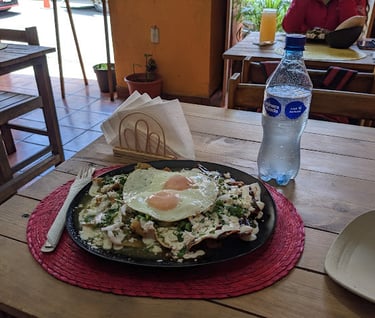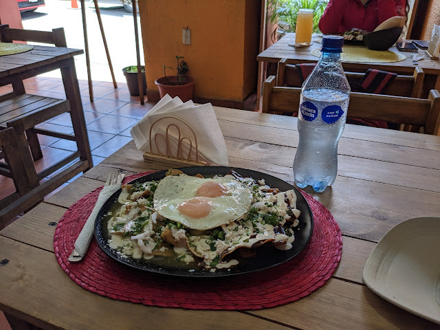 Famished, I found a chilaquiles cafe nearby and ordered chilaquiles verdes con pollito, not quite sure knowing what I was ordering. I know verde and I know pollo, but what's a chilaquiles dish? All I know is that a Oaxaqueño amigo back home in Mount Shasta said that I HAD to try chilaquiles.