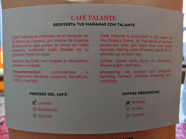 I woke up in my new digs after a nap and took inventory. Sure enough, there's a moka pot in the apartment. I immediately dash out to find Cafe Talante close by for some fresh roast ground Oaxaqueño coffee. Turns out Talante is not just a modest little neighborhood cafe, but they produce their own coffee. It's 100% women run. I learned to ask for asado medio, molienda media. Medium roast, medium grind for a mocha pot. Morning coffee solved!